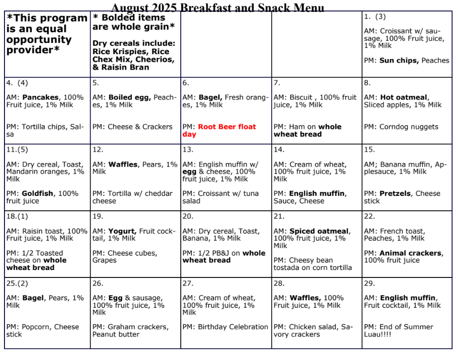 We serve a nutritious breakfast, lunch and afternoon snack which is prepared daily in our commercial kitchen.