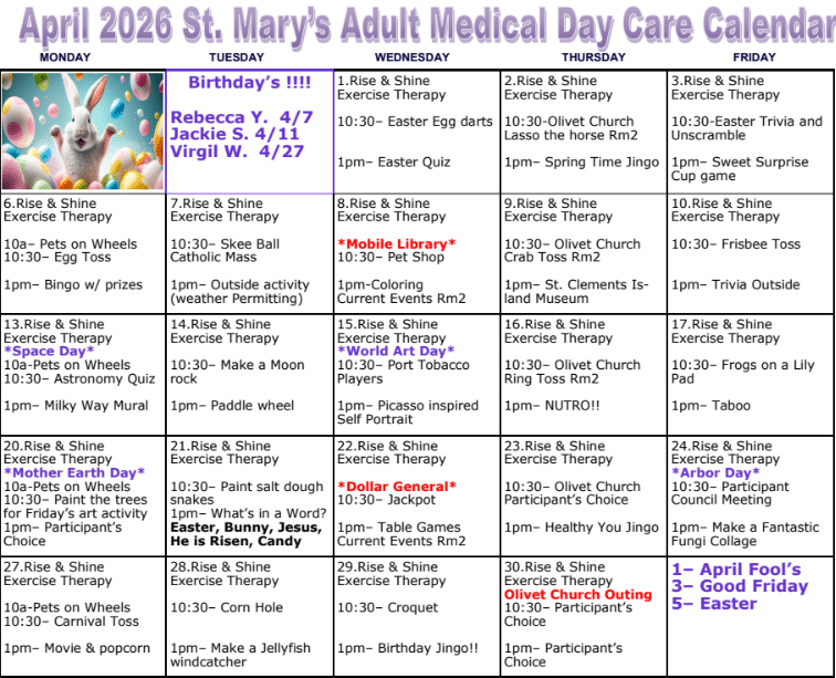 At St. Mary’s Adult Medical Day Care, we offer respite for caregivers and provide participants with a place for socialization, therapeutic activities, and a sense of community.