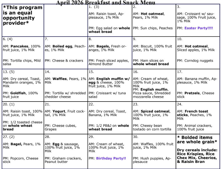 We serve a nutritious breakfast, lunch and afternoon snack which is prepared daily in our commercial kitchen.